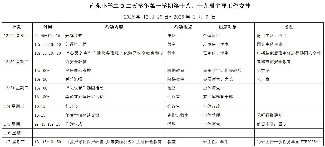 南苑小学二O二五学年第一学期第十八、十九周工作安排