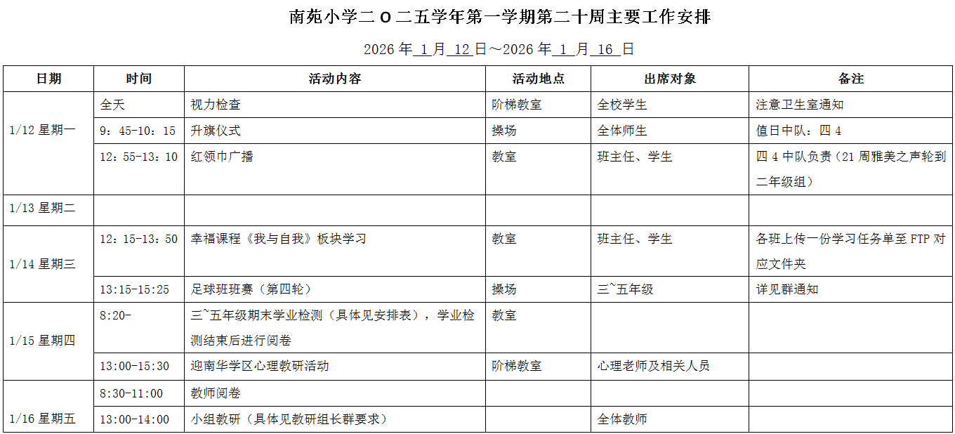 南苑小学二O二五学年第一学期第二十周工作安排
