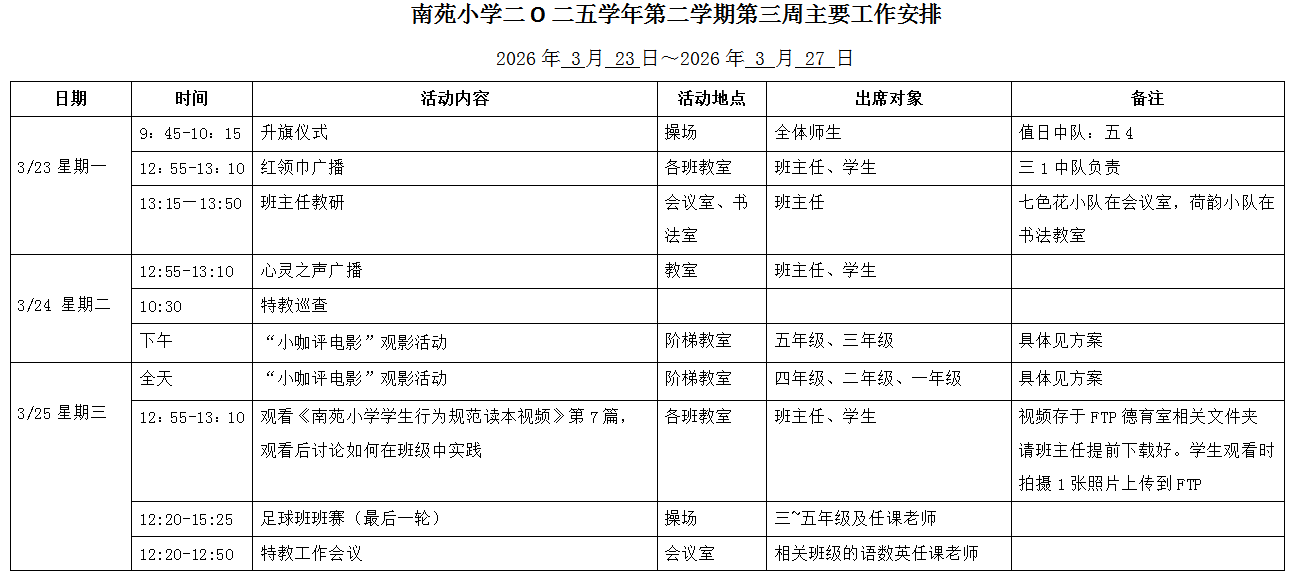 南苑小学二O二五学年第二学期第四周工作安排